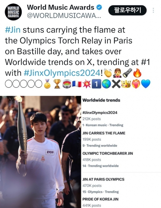월드 뮤직 어워즈 공식 계정은 프랑스 혁명기념일에 진행된 진의 성화 봉송 소식과 함께 진의 소감을 전하며 진이 X(옛 트위터)에서 전 세계 트렌드 1위를 차지했다고 전했다.