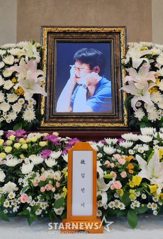 지난 21일 위암 투병 끝에 별세한 '포크 대부' 김민기(73) 전 학전 대표의 영정사진이 22일 서울 연건동 서울대학교병원 장례식장에 마련된 빈소에 놓여 있다. /사진제공=학전 2024.07.22