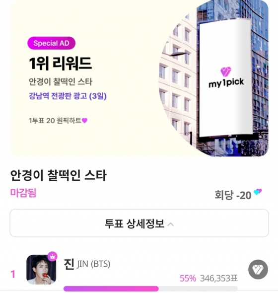 진은 7월 24일~7월 28일까지 마이원픽(MY1PICK)에서 진행한 테마 투표 '안경이 찰떡인 스타는?'에서 34만 6353표를 얻어 전체 득표율 55%로 압도적인 1위에 올랐다.