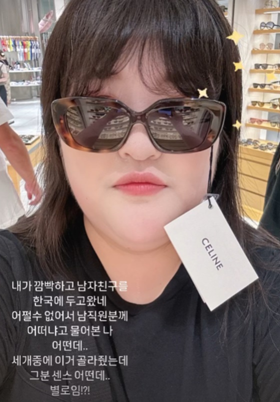 상품을 구매 전 선글라스를 착용해 본 이국주는 "내가 깜빡하고 남자친구를 한국에 두고 왔네. 어쩔 수 없어서 남직원분께 '어떠냐고 물어본 나 어떤데"라고 전했다.