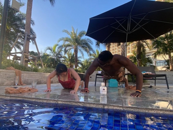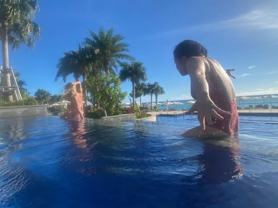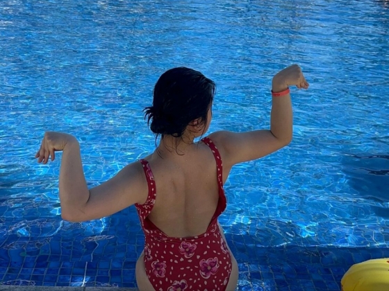 사진 속 박나래는 해외의 한 리조트 수영장에서 빨간색 수영복을 입은 채 여유를 즐기고 있는 모습. 그는 한 외국인 남성과 윗몸일으키기 대결을 하면서 탄탄한 근육을 자랑했다.