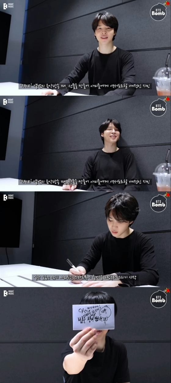 영상에는 지난해 3월, 데뷔 10년 만에 첫 솔로 앨범 '페이스(FACE)'를 발매한 뒤 지민이 단독 출연한 음악방송을 찾을 팬들을 위해 직접 역서포트 선물을 준비하는 과정이 담겼다.