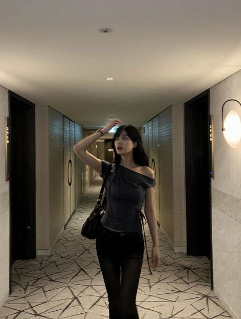 공개된 사진 속 율희은 오프숄더 상의로 엣지 있는 라인을 선보이고 있다.