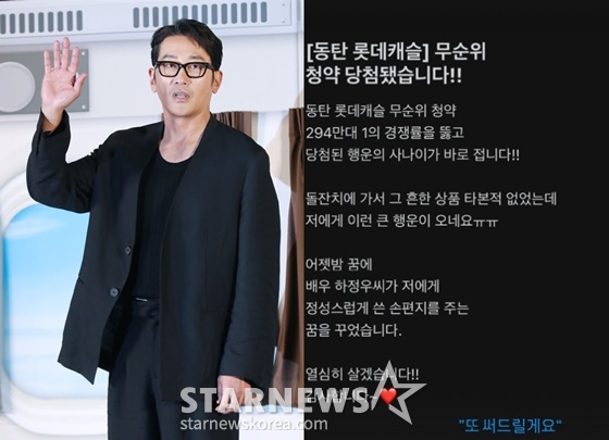 배우 하정우가 '역대급 로또청약'으로 불린 '동탄역 롯데캐슬' 무순위 청약에 당첨됐다는 팬의 후기에 뿌듯해했다.