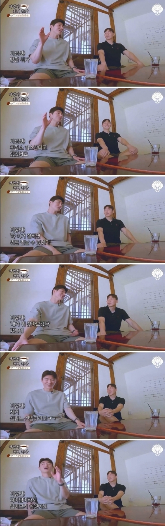 이어 "근데 이게 레전드가 아니라 진짜 더 레전드는 일주일 정도 훈련소생활을 하고 있는데 뷔가 입대한다는 것이다. 잘하면 뷔를 만날 수 있겠다"며 당시의 기대감을 느낄 수 있는 표정으로 말을 이어갔다.
