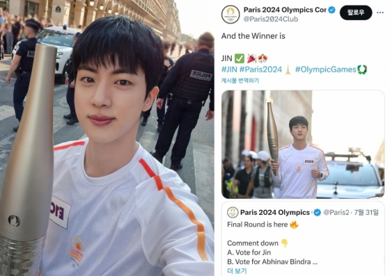 방탄소년단(BTS) 진이 '최고의 올림픽 성화봉송 순간' 1위를 차지하며 전 세계 최고의 인기를 실감케 했다.