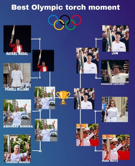 2024 파리 올림픽 코멘터리 공식 계정은 지난 7월 27일부터 파리 올림픽 성화봉송주자들을 후보로 두고 투표를 진행했다. 진은 포뮬러 원(F1)에서 활동하며 수많은 우승을 차지한 모나코의 자동차 경주 선수 샤를 르클레르(Charles Leclerc), 미국 유명 배우 할리 베리(Halle Berry), 테니스 역사상 최고라고 불리는 빅3 중 한명인 스페인의 레전드 테니스 선수 라파엘 나달(Rafael Nadal), 인도의 최초이자 유이한 올림픽 개인 종목 금메달리스트인 사격 선수 아비나브 빈드라(Abhinav Bindra) 등 글로벌 슈퍼스타들 사이에서 1위를 차지하며 최고 글로벌 슈퍼스타의 위용을 자랑했다.