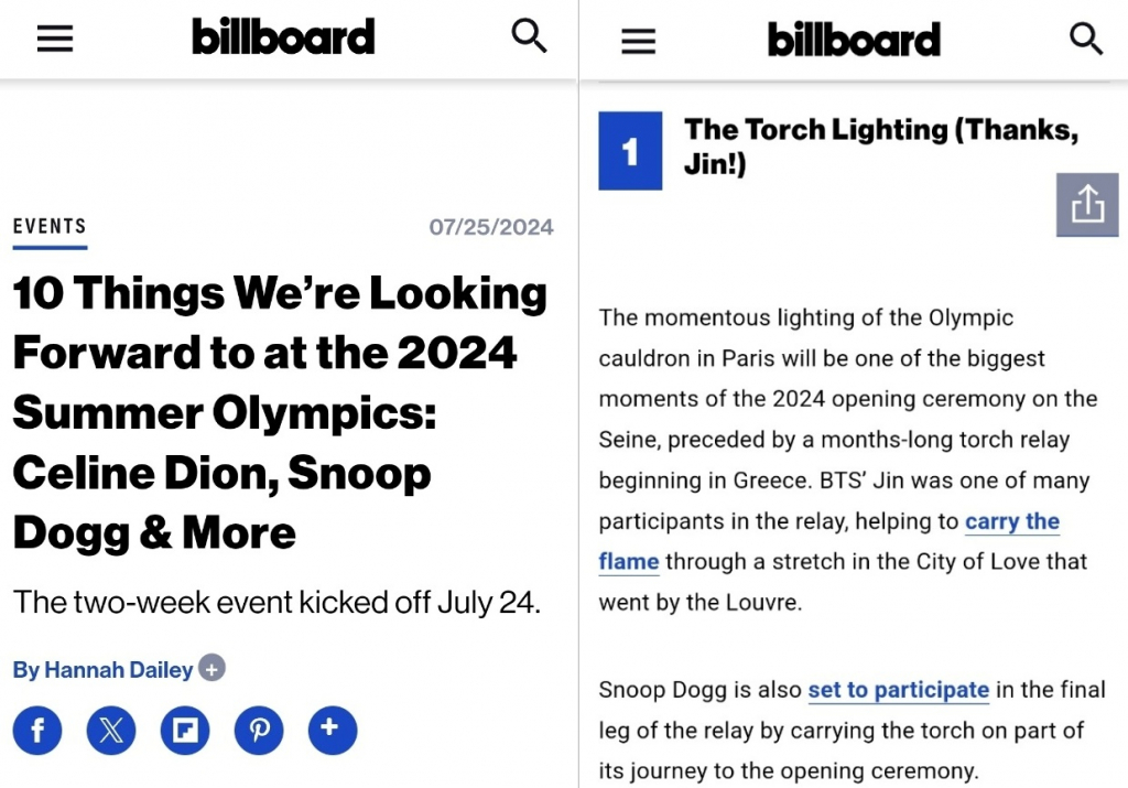 2024 파리 올림픽 코멘터리(해설)의 X(옛 트위터) 공식 계정은 지난 8월 2일 진이 '최고의 올림픽 성화봉송 순간' 1위를 차지했다고 발표했다.