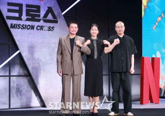 배우 황정민, 염정아, 이명훈 감독이 5일 오전 서울 앰배서더 서울 풀만 호텔에서 진행된 넷플릭스 오리지널 영화 '크로스'(감독 이명훈) 제작발표회에 참석해 포즈를 취하고 있다.