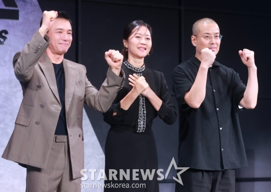배우 황정민, 염정아, 이명훈 감독이 5일 오전 서울 앰배서더 서울 풀만 호텔에서 진행된 넷플릭스 오리지널 영화 '크로스'(감독 이명훈) 제작발표회에 참석해 포즈를 취하고 있다.