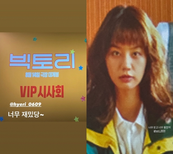 전날 혜리가 출연한 영화 '빅토리'(감독 박범수)의 VIP 시사회가 개최됐다. 해당 VIP 시사회에는 걸스데이 멤버 민아, 유라, 소진을 비롯해 배우 정호연, 변우석, 이제훈, 이동휘, 이선빈, 김도훈, 박진주, 장기용, 강한나, 블랙핑크 지수, 세븐틴 승관 등 수많은 스타들이 참석했다.