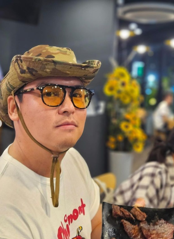 노란색 선글라스를 쓴 이장우는 고기가 올려진 접시를 들고 사뭇 진지한 표정을 짓고 있다.