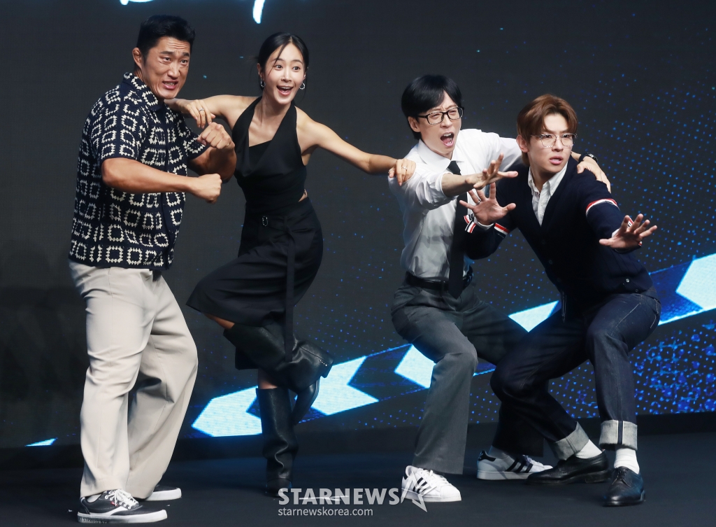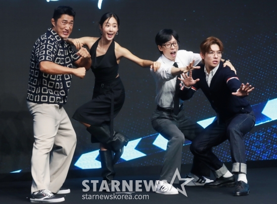김동현, 권유리, 유재석, 덱스가 6일 오전 서울 여의도 콘래드호텔에서 진행된 디즈니+ 예능 '더 존 : 버텨야 산다3' 제작발표회에 참석해 포즈를 취하고 있다.