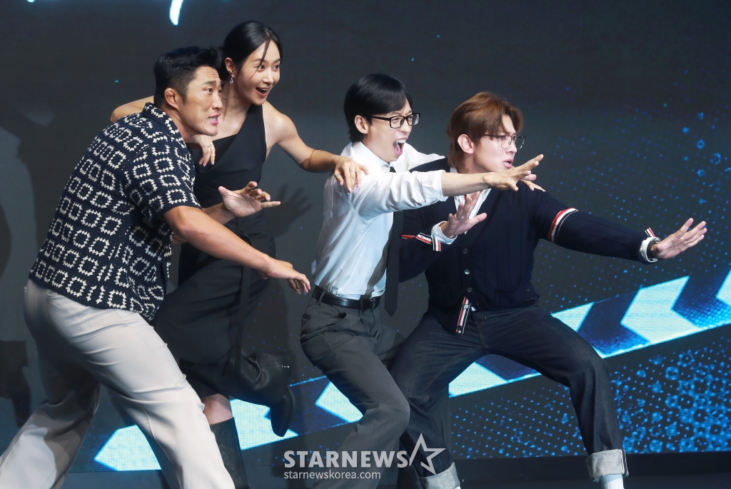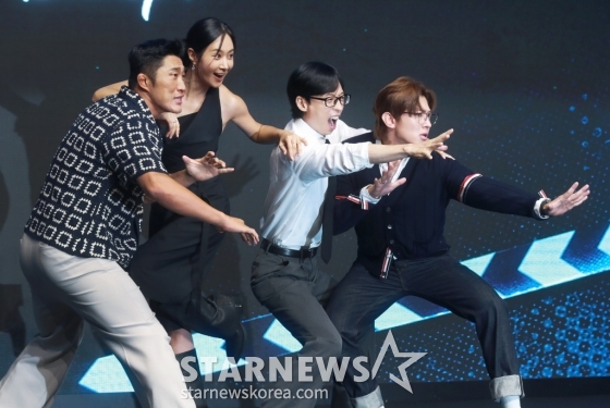 김동현, 권유리, 유재석, 덱스가 6일 오전 서울 여의도 콘래드호텔에서 진행된 디즈니+ 예능 '더 존 : 버텨야 산다3' 제작발표회에 참석해 포즈를 취하고 있다.