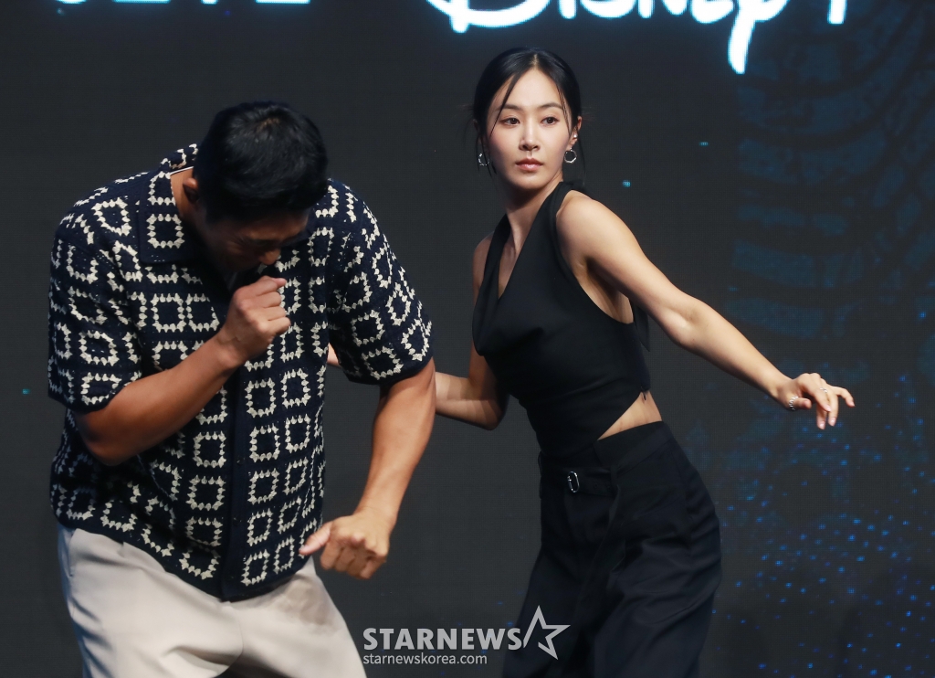 김동현, 권유리가 6일 오전 서울 여의도 콘래드호텔에서 진행된 디즈니+ 예능 '더 존 : 버텨야 산다3' 제작발표회에 참석해 포즈를 취하고 있다.