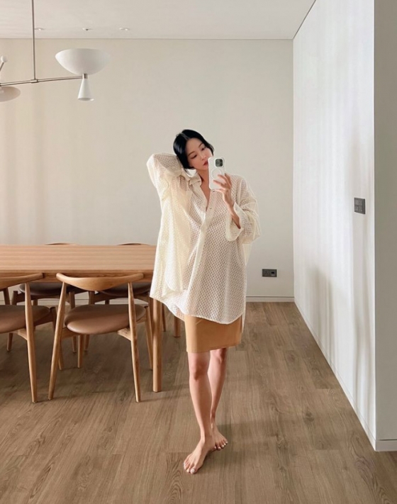 공개된 사진 속엔 한예슬이 시스루 셔츠와 베이지색 원피스를 입고 맨발로 포즈를 취한다. 남다른 비율을 자랑하는 그는 편안한 옷차림을 보여 독특한 분위기를 자아낸다.