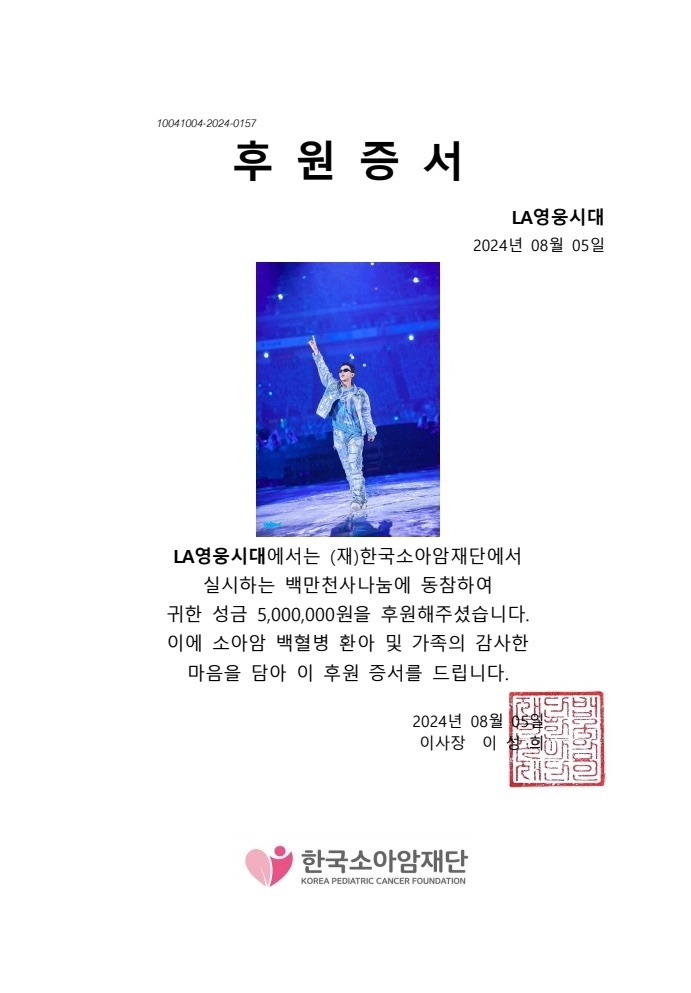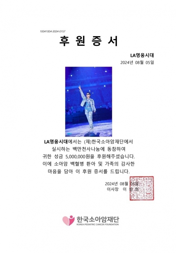 임영웅 팬클럽 'LA영웅시대'는 임영웅 데뷔 8주년(8월 8일)을 기념, 지난 5일 한국소아암재단에 500만 원을 후원했다.