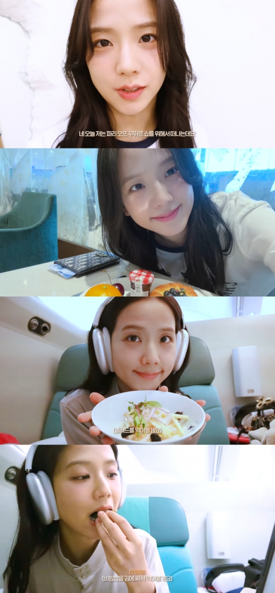 영상 속 지수는 "오늘은 꼭 비행기에서 먹방하는 거를 찍어보도록 하겠습니다"라며 포부를 전했다. 그는 "저는 지금 라운지에 들어왔습니다. 눈치 보면서 찍고 있는데요. 일단은 이렇게 빵을 먹고 싶어서 이거를 간단하게 먹고 비행기를 타서 좀 먹으려고요"라며 사랑스러운 먹방을 개시했다.