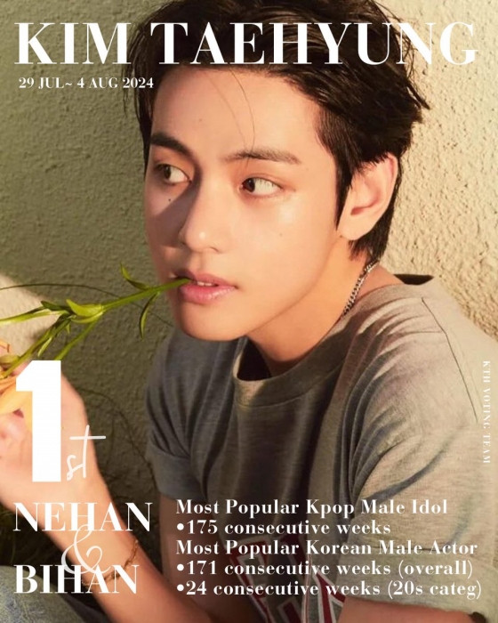 뷔는 7월 29일부터 8월 4일까지 일본 인기 아이돌 랭킹 사이트 '네한'(NEHAN)에서 진행한 K팝 남자 아이돌 랭킹 투표에서 1위에 올랐다. 175주 연속 1위 대기록이다.