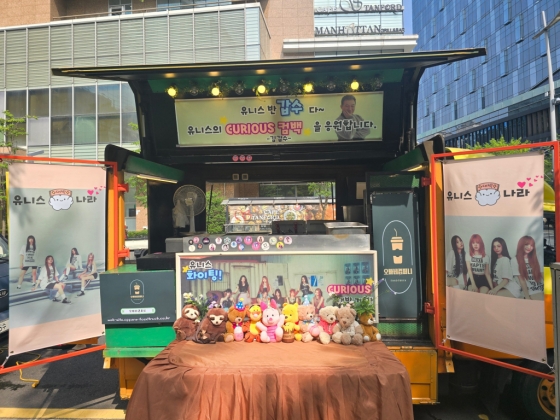 커피차 선물을 받은 유니스는 인증샷으로 애정 어린 응원에 화답했다. 또 멤버들은 "생각지도 못한 엄청난 선물을 보내주셔서 너무 감사하다. 더 힘이 난다"며 "김갑수 선배님의 응원을 받아 이번 'CURIOUS' 활동도 열심히 하겠다"고 감사함을 표했다.