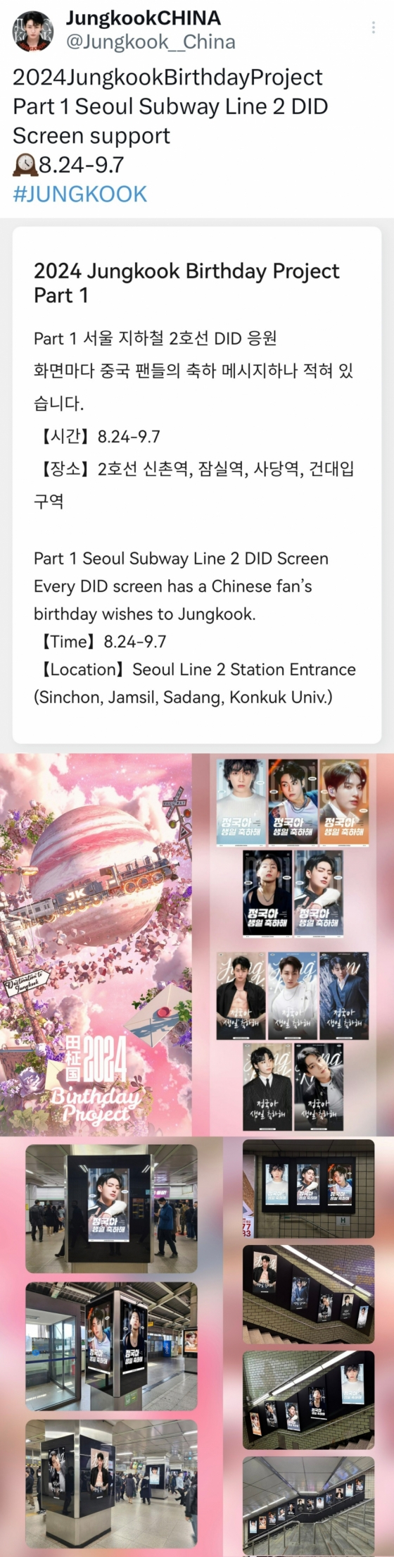 정국의 중국 팬클럽 '정국 차이나'는 9월 1일 정국의 생일을 기념해 8월 24일~9월 7일까지 서울 지하철 2호선 신촌역, 잠실역, 사당역, 건대 입구역 DID 스크린에서 축하 영상을 송출한다.