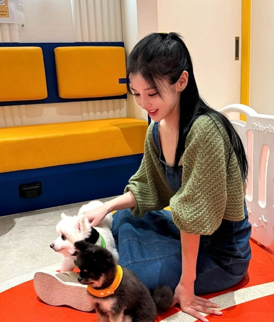 애견 카페를 방문한 강다은은 강아지들과 행복한 시간을 보내고 있다.