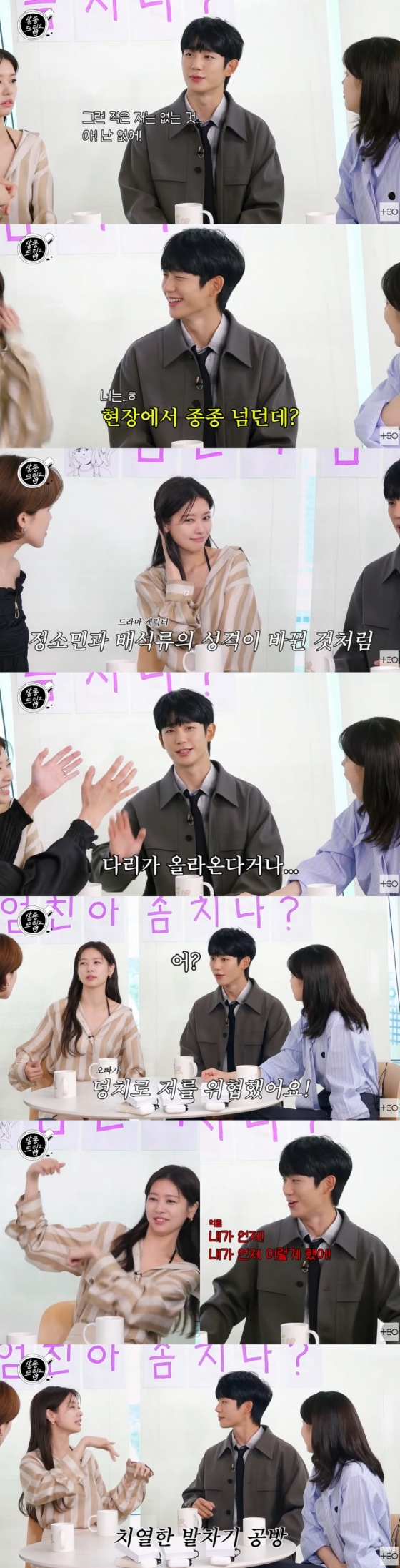 이어 정해인은 "어제 촬영장에서 정소민과 캐릭터 배석류가 바뀐 것 같은 느낌을 받았다. 촬영장에서 카메라가 안 돌아가고 있는 상황에도 과격한 스킨십이라든지. 다리가 올라온다거나"라며 정소민의 파격 행동을 언급했다.