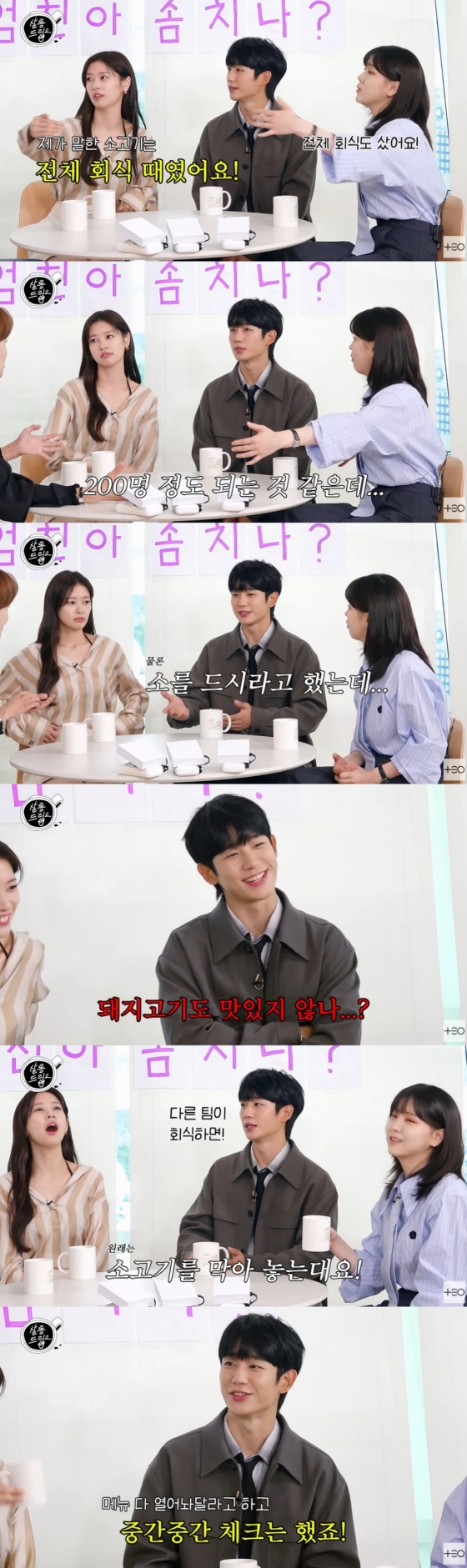 이어 그는 "원래 비하인드가 그 집이 회식을 종종 하는 곳인데 다른 팀이 회식하면 소고기를 막아 놓는다고 하더라. 그게 너무 불편했다. 메뉴판에 있고 눈에 보이는데 막아놓는 게 그렇다고 해서 메뉴 다 열어놔달라고 했다. 근데 중간중간 체크는 했다. 술이 들어가면서 팍팍 올라가더라"라며 전체 회식 당시를 떠올렸다.