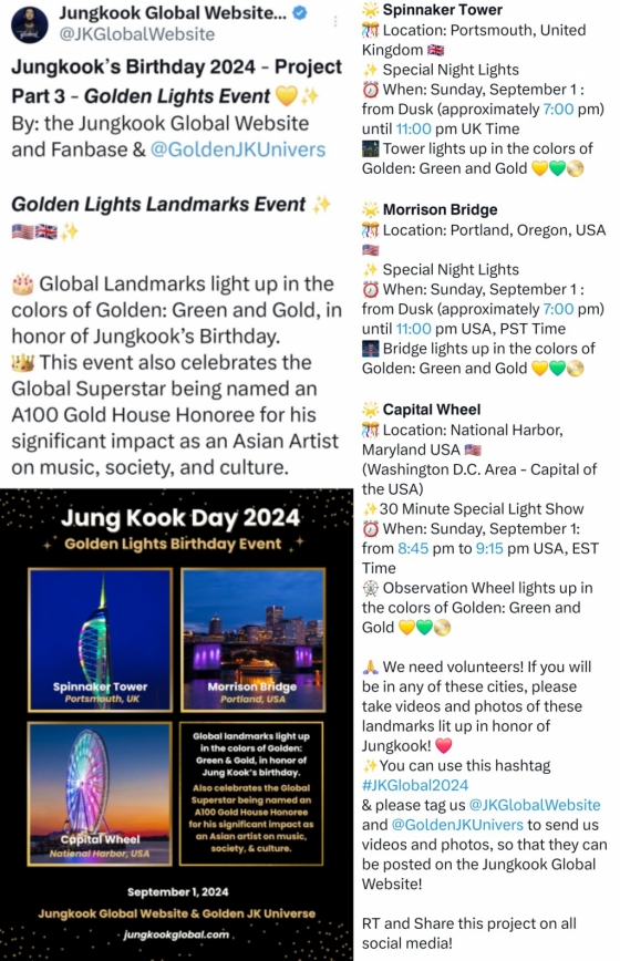 정국의 해외 팬 베이스 '정국 글로벌 웹사이트'(Jungkook Global Website)와 '골든 JK 유니버스'(Golden JK Univers), 팬들은 정국의 생일을 기념하여 글로벌 랜드마크 3곳에서 'Golden Lights Event'(골든 라이트 이벤트) 서포트를 진행한다.