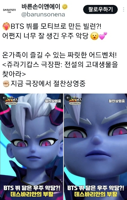 뷔를 모티브로 한 매력적인 빌런이 애니메이션 영화에서 등장했다. 8월 15일 영화 기생충 제작으로도 유명한 바른손이앤에이가 만든 어드벤처 애니메이션 '쥬라기캅스 극장판: 전설의 고대생물을 찾아라'가 개봉됐다.