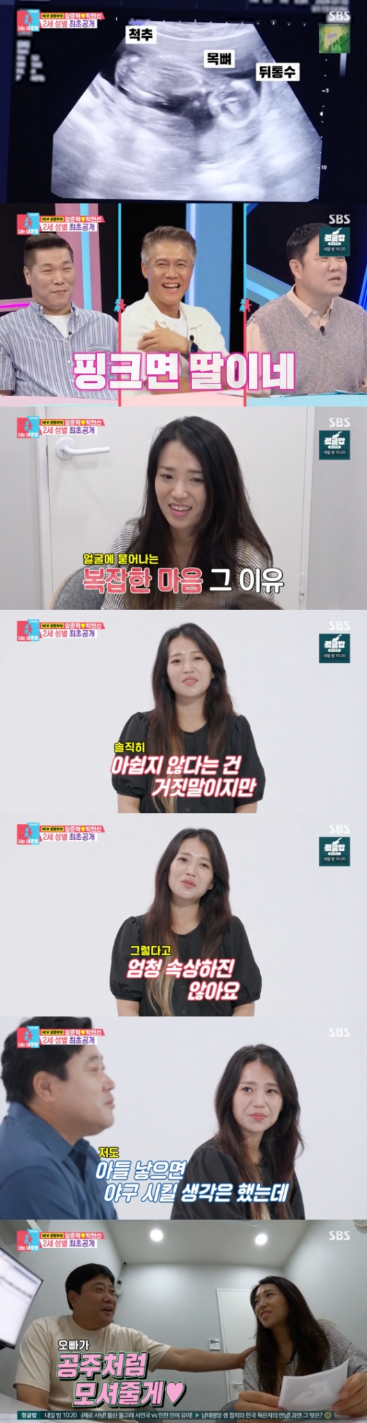 내심 아들을 바랐던 박현선은 "(아들이 아니라서) 아쉽지 않다는 건 거짓말이지만 그렇다고 엄청나게 속상하진 않았다"라고 털어놨고 양준혁은 "아들을 낳으면 야구를 시킬 생각도 하긴 했다. 그런데 나는 솔직히 딸도 너무 좋다. 오히려 아내한테 '딸 낳으면 내가 키울게'라고 말했다. 아빠는 딸이 더 좋다"라고 답했다.