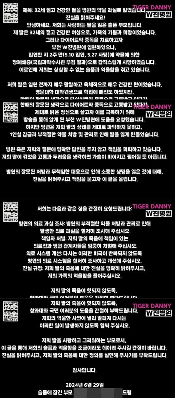 A씨의 부모는 "32세 젊고 건강한 딸을 병원의 약물 과실로 잃었습니다. 진실을 밝혀주세요!"라며 "제 딸은 32세의 젊고 건강한 여성으로, 가족의 기쁨과 희망이었습니다. 그러나 다이어트약 중독을 치료하고자 부천 W진병원에 입원하였으나, 입원한 지 2주 만(5.10 입원, 5.27 사망)에 약물에 의한 장폐쇄증(국립과학수사원 부검 결과)으로 갑작스럽게 사망하였습니다. 이로인해 저희는 상상할 수 없는 슬픔과 억울함을 겪고 있습니다"라고 전했다.