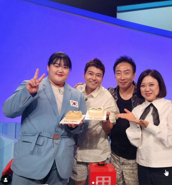 사진에는 역도선수 박혜정과 포즈를 취하고 있는 전현무의 모습이 담겨있다. '사장님 귀는 당나귀 귀' 스튜디오에서 박명수, 김숙과 함께 촬영에 임한 것. 박혜정이 깜짝 게스트로 출연해 녹화를 진행한 것으로 보인다.