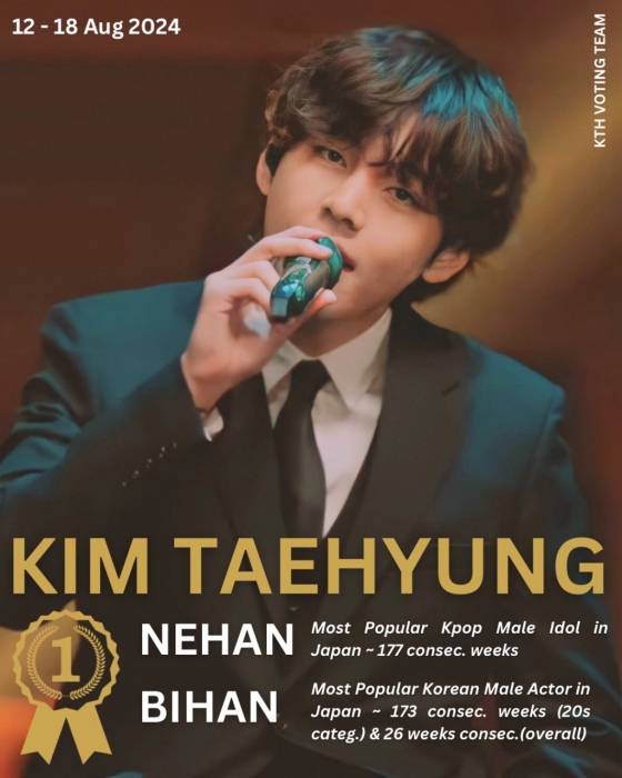 뷔는 8월 12일부터 8월 18일까지 일본 인기 아이돌 랭킹 사이트 '네한'(NEHAN)에서 진행한 K팝 남자 아이돌 랭킹 투표에서 177주 연속 1위에 올랐다.