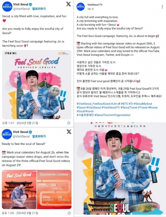 서울관광재단은 8월 21일 인스타그램, X(옛 트위터), 페이스북, 유튜브 등 공식 SNS를 통해 진이 출연한 '필 소울 굿'(Feel Soul Good) 캠페인이 곧 시작된다고 알리며 새 캠페인 소식을 전했다.