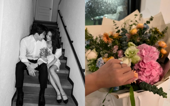 공개된 사진 속에는 계단에 나란히 앉아 남편과 마주 보고 웃는 손연재의 모습이 담겼다. 두 사람의 닮은 듯한 미소가 훈훈함을 안긴다. 특히 손연재는 남편에게 선물받은 듯한 꽃과 다이아 반지를 자랑해 눈길을 끌었다.