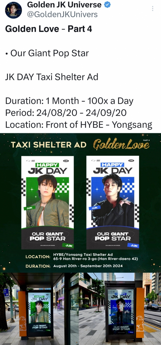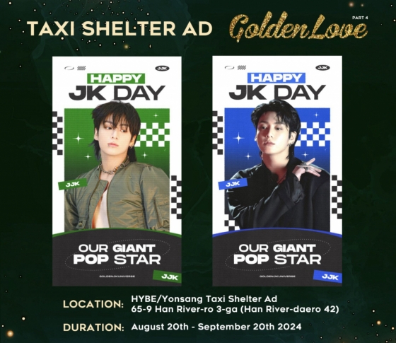 정국의 해외 팬 베이스 '골든 JK 유니버스'(Golden JK Univers)는 소셜미디어(SNS)를 통해 '우리의 거대한 팝스타 JK DAY 택시 쉘터' 광고라는 생일 서포트를 진행한다고 밝혔다.