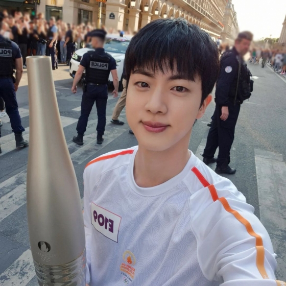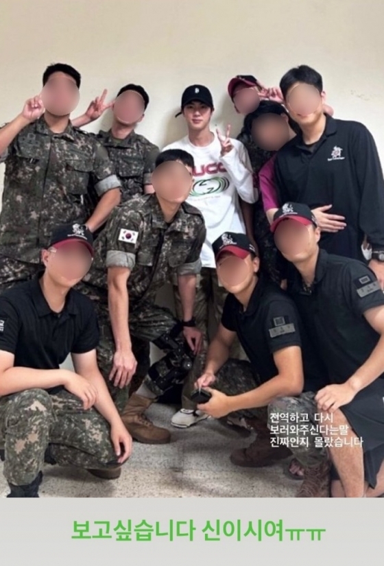 사진 속에서 블랙 볼캡에 흰 티셔츠를 착용한 '비주얼 킹' 진은 후임들에 둘러싸여 손가락으로 승리의 브이를 그리며 미소짓고 있다. 진의 군대 후임들은 사진에 "전역하고 다시 보러 와주신다는말 진짜인지 몰랐습니다", "보고싶습니다 신이시여ㅠㅠ" 등의 문구로 진을 다시 본 반가움과 그리움을 드러냈다.