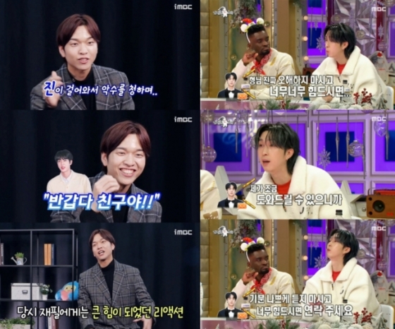 2020년 SBS '가요대전' 레드카펫에서 MC를 맡았던 유재필은 진과 같은 1992년생으로, 인터뷰에서 한두번 본 사이인데 당시 진에게 장난을 쳤다고 밝혔다. 방송 인터뷰 중 방탄소년단 멤버가 "내년에 저희 진 형이 30대가 되거든요. 그래서 진 형이 행복했으면 좋겠습니다"라고 말하자 유재필이 "저도 서른 살이 되는 해입니다"라고 답했다는 것. 그 말을 들은 진이 유재필에게 걸어와 악수를 청하며 "반갑다 친구야!"라고 말했고, 슈퍼스타 진이 이런 리액션을 한 일은 당시 유재필에게 큰 힘이 됐다고 고백하며 진과 꼭 한 번 인터뷰를 해보고 싶다는 소망을 밝혔다.