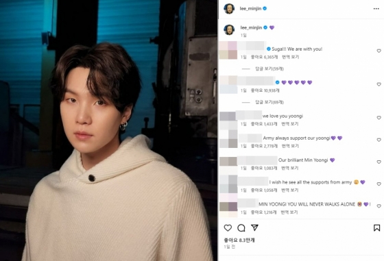 지난 24일 애플TV+ 오리지널 시리즈 '파친코'를 원작 집필한 이민진 작가는 자신의 SNS 계정에 슈가의 사진과 함께 보라색 하트 이모티콘을 덧붙여 게시물을 올렸다. 여기에 그는 슈가와 소속사 빅히트 뮤직 공식 계정을 태그하기도 했다.