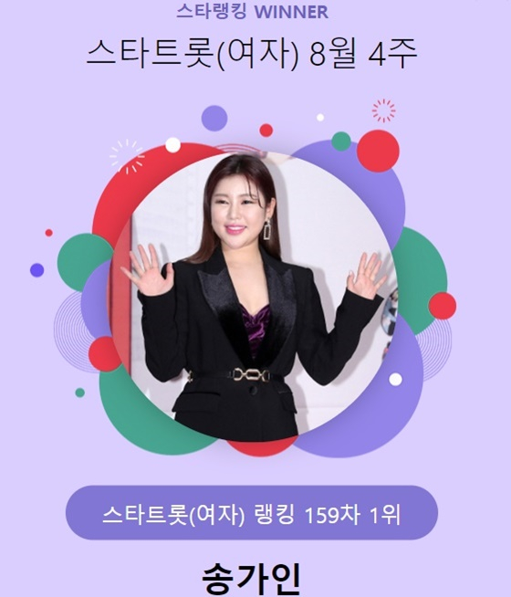 송가인은 지난 22일 오후 3시 1분부터 29일 오후 3시까지 진행된 8월 4주(159차) 스타랭킹 스타트롯 여자 부문 랭킹 부문에서 4만 7401표를 획득하며 1위에 올랐다.