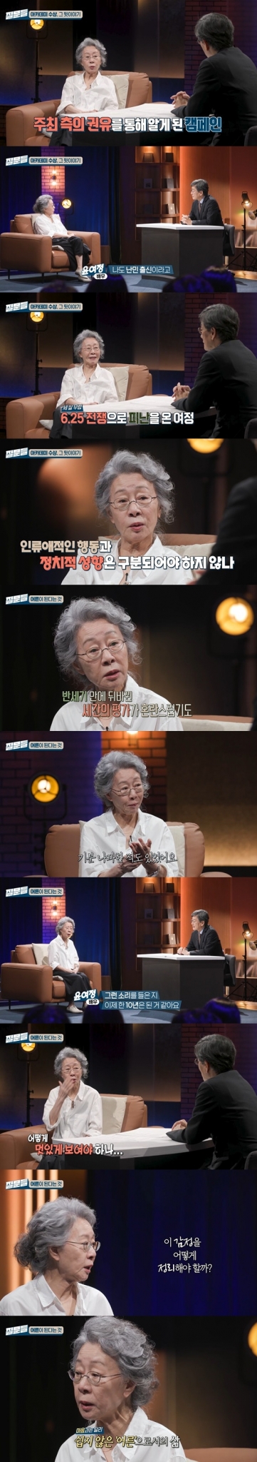 이에 손석희는 "하지만 이런 행동을 정치적으로 보는 사람들도 있지 않냐"라고 물었고, 윤여정은 "그러니까요, 제일 많이 당하셨겠죠?"라고 혀를 내둘렀다. 손석희는 "그건 여러분께서 판단하시길"이라며 말을 아꼈다.