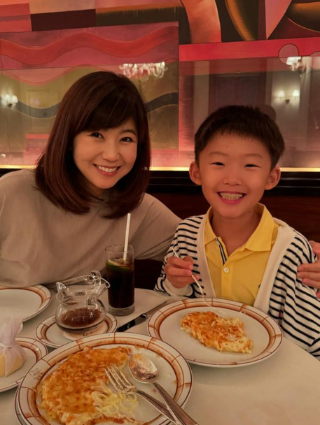 사진 속 강수정은 제민이와 식당에서 식사하며 미소를 짓고 있다.