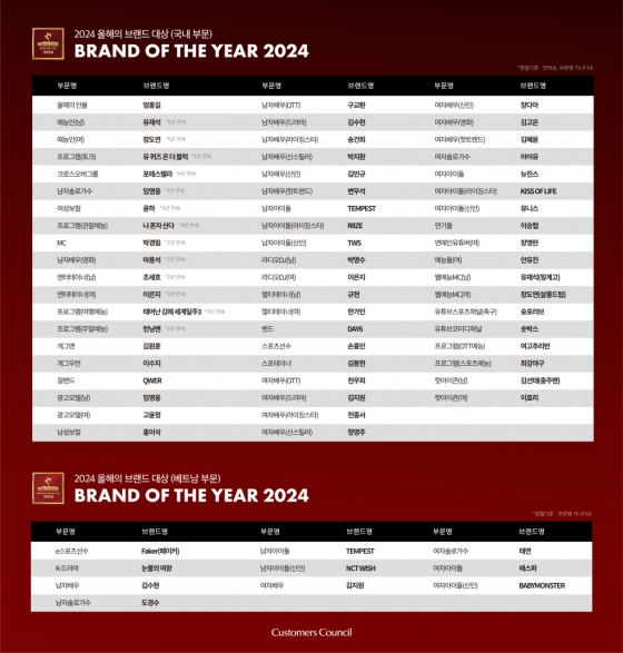 2024 올해의 브랜드 대상 인물·문화 부문은 언론보도, 방송프로그램, SNS, 주요 포털사이트의 콘텐츠평판과 전문기관 인증 등에 기초한 주요 이슈 분석을 통해 262개 브랜드를 1차 선별하고, 이 후보들을 대상으로 지난 7월 8일부터 21일까지 국내 및 베트남에서 2주간 대규모 소비자 투표가 진행됐다.