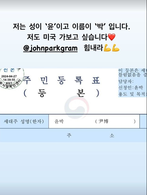 윤박은 3일 자신의 인스타그램에 "난 성이 윤이고 이름이 박이다. 나도 미국에 가보고 싶다. 존박 힘내라"고 말했다.