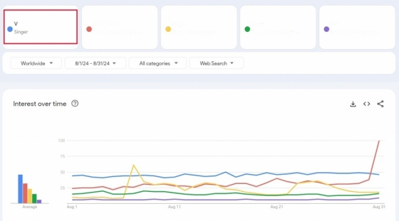 구글 트렌드(Google Trends)에 따르면, 뷔는 8월 한 달간 K팝 스타 중 최다 검색량을 기록하며 최고의 화제성을 기록했다.