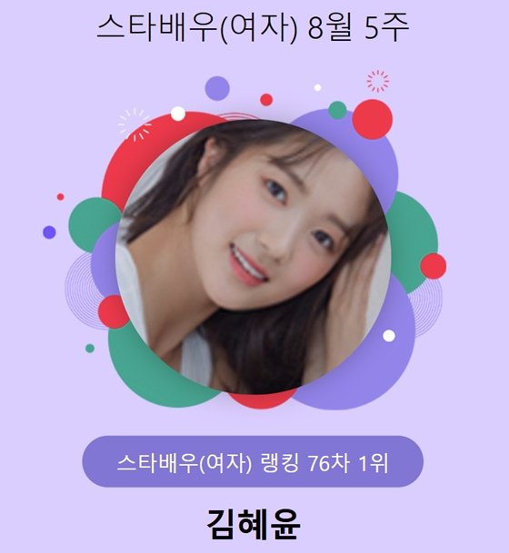 김혜윤은 지난 8월 29일 오후 3시 1분부터 9월 5일 오후 3시까지 진행된 8월 5주(76차) 스타랭킹 스타배우 여자 랭킹 투표에서 1위를 차지했다.