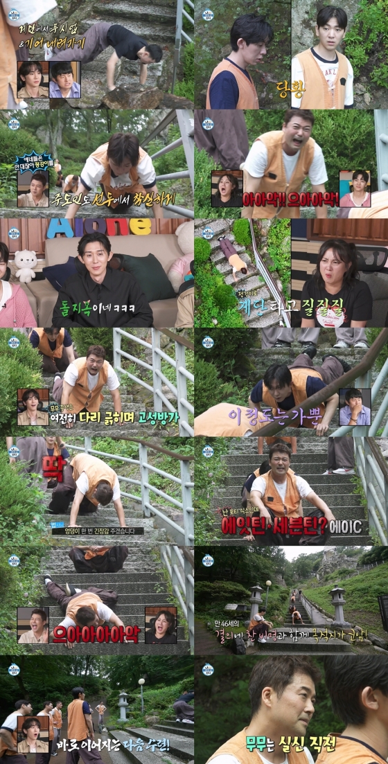 정강이로 계단을 타고 질질질 내려가던 전현무가 전진하지 못하자, 법사님이 등장해 "내 몸이 아니라고 생각하세요"라며 긴장감을 유발하는 '엉덩이 매타작'을 선보인다. 30년 만에 맞아보는 엉덩이 통증을 느끼는 전현무의 반응이 폭소를 안긴다. 이후 108계단 수련의 다음 단계 시범을 보고 웃음기가 싹 사라진 코드 쿤스트와 이주승 그리고 실신 직전인 전현무의 표정이 이어져 긴장감을 더한다.