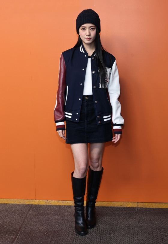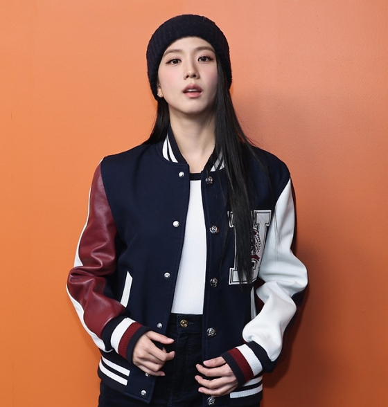 이날 지수는 네이비와 버건디 조합의 가을 만능템 바시티 재킷과 미니 스커트, 여기에 비니를 매치한 뉴 아메리칸 프레피룩으로 스포트라이트를 받았다.