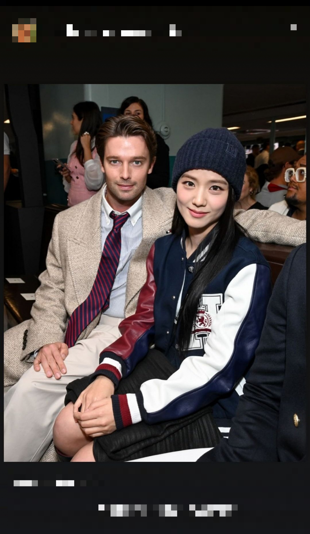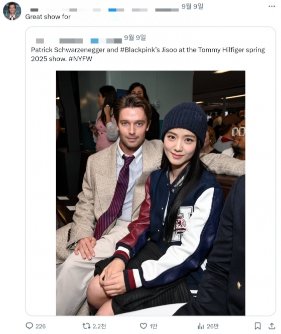 지난 9일 패트릭 슈워제네거는 패션 매거진 하퍼스 바자 홍콩의 인스타그램 게시물을 리그램하고 지수의 개인 계정을 태그했다.